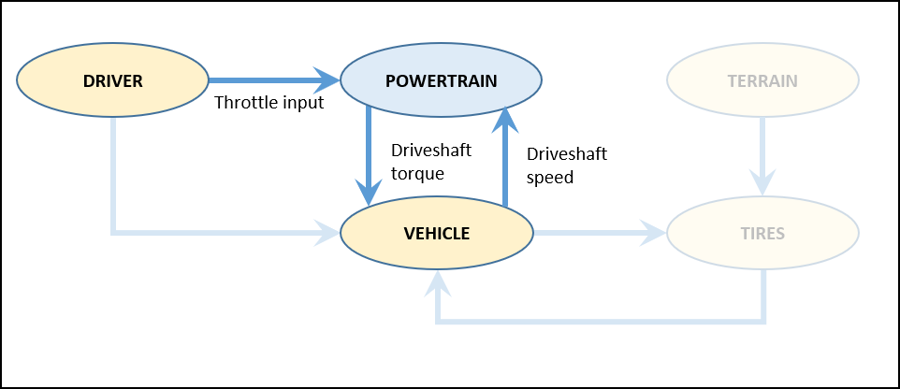 The powertrain system is connected to the driver system (receiving throttle inputs) and to the driveline sub-system of the vehicle system (receiving the driveshaft angular speed and sending the driveshaft torque).