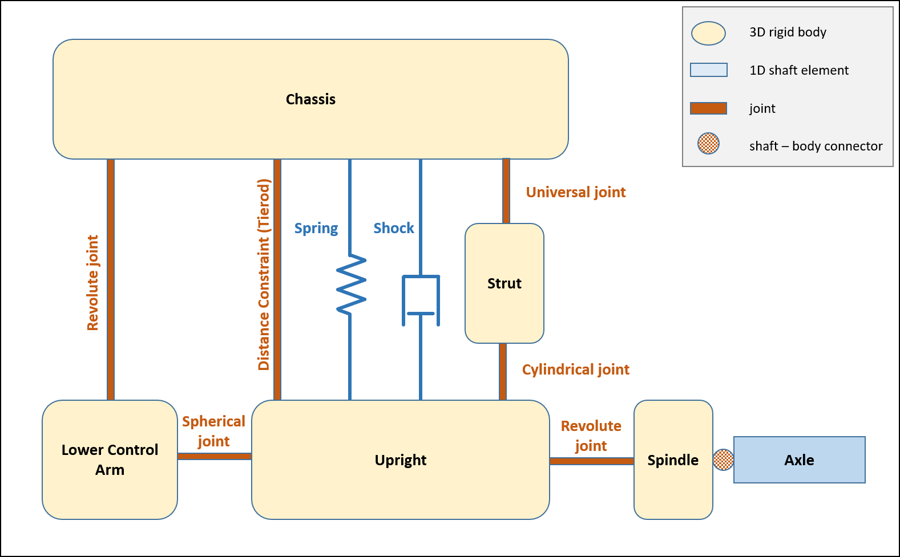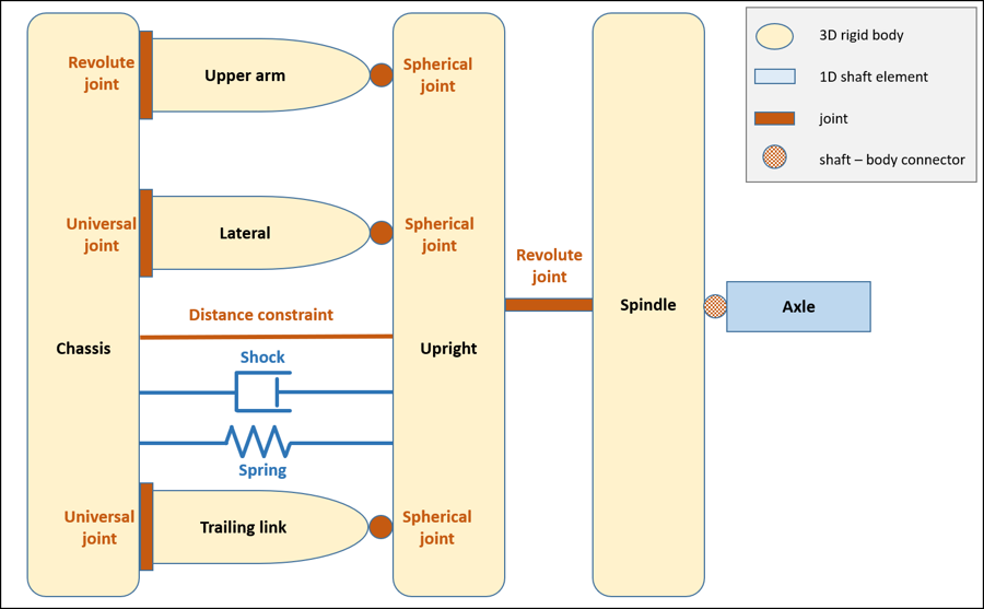 This simplified double-wishbone suspension template models the lower and upper control arms using two distance constraints for each. This suspension type is suitable when the mass and inertia of the control arms are small relative to the other bodies in the system and can therefore be neglected.