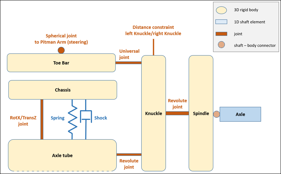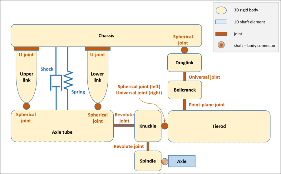 A suspension subsystem is a model of one axle of a wheeld vehicle. The base class [ChSuspension](@ref chrono::vehicle::ChSuspension) imposes that any derived suspension class (a suspension template) provide two wheel spindles (left and right) each connected through a revolute joint to some part of that type of suspension, and two spindle axles (elements of [ChShaft](@ref chrono::ChShaft) type) which may be connected to a vehicle driveline if that axle is driven.